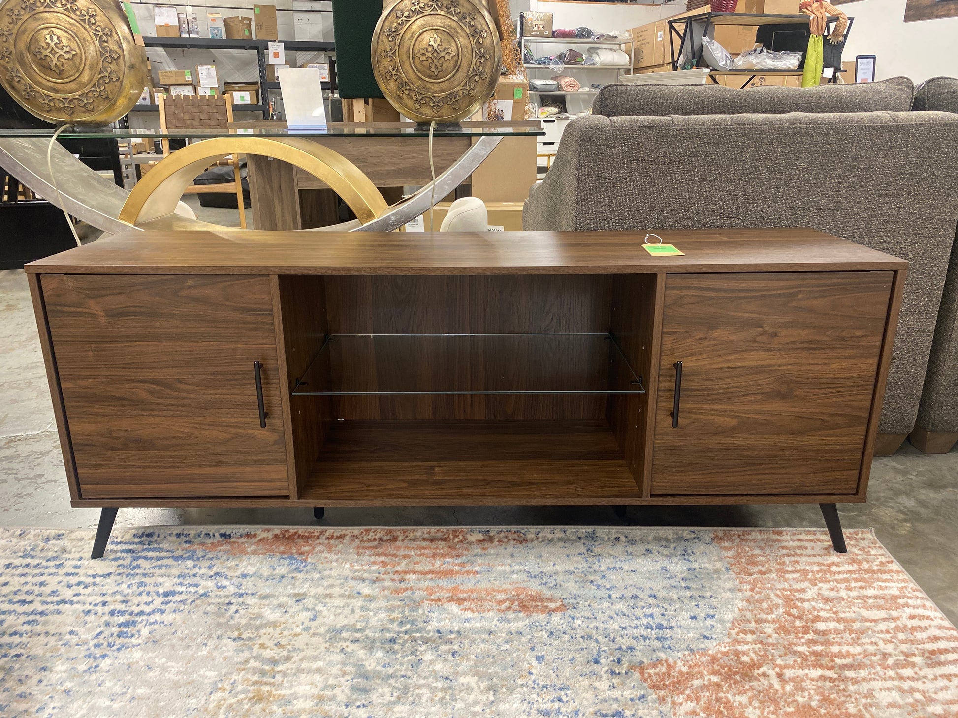 Nora 60in Mid Century Modern 2 Door TV Stand - Dark Walnut | Dimensions: 24in H x 60in L x 16in W | Weight: 80 LBS | Retail Price: $221